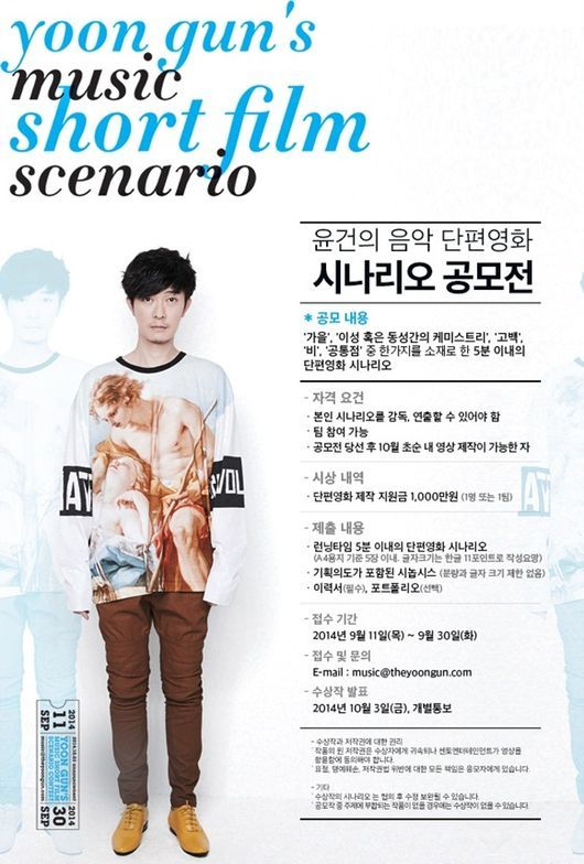 윤건은 지난 11일부터 대한민국 대중문화의 저변을 확대하고, 창작에 대한 꿈을 키워가고 있는 후배 크리에이터 양성을 위해 음악 단편영화 시나리오 공모전을 진행하고 있다. 1등(1명 또는 1팀)에게는 상금 1000만 원이 단편영화 제작 지원금으로 주어진다.