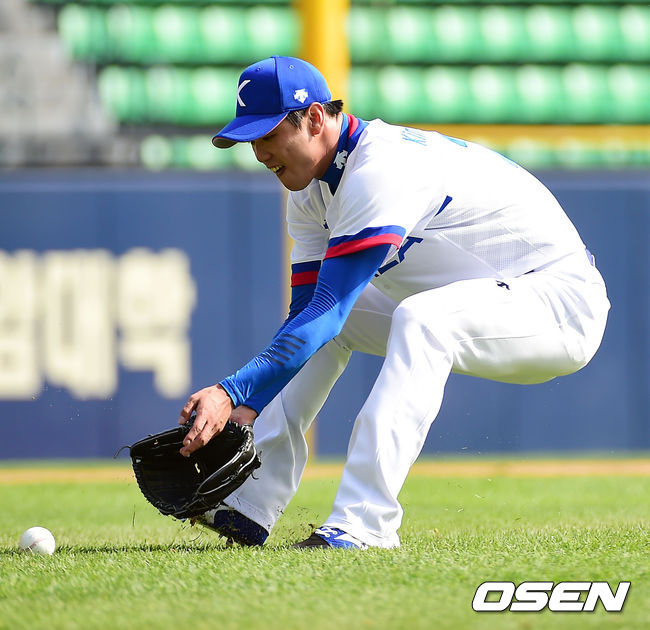 16일 오후 서울 잠실야구장에서 열린 AG 야구 대표팀 훈련 중 수비훈련에서 김광현이 볼을 잡고 있다.