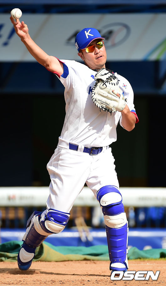 16일 오후 서울 잠실야구장에서 열린 AG 야구 대표팀 훈련 중 수비훈련에서 강민호가 1루로 송구하고 있다.