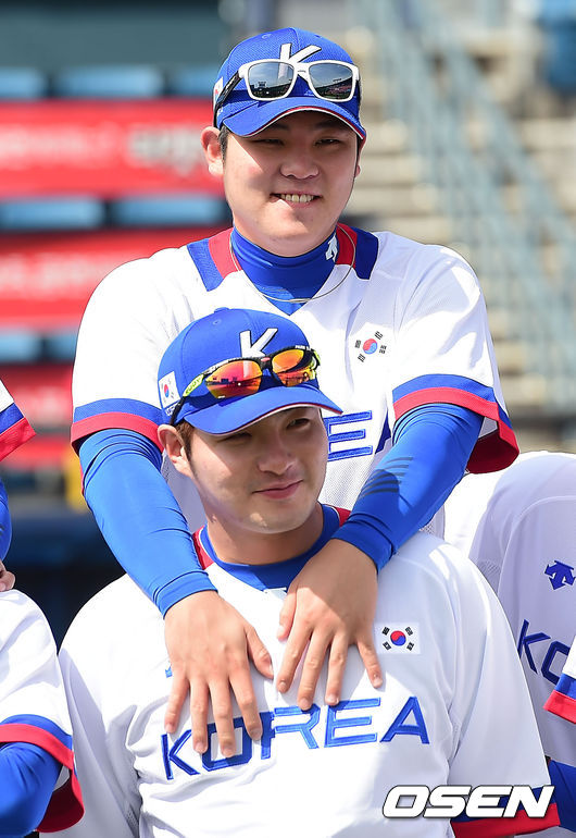 16일 오후 서울 잠실야구장에서 열린 AG 야구 대표팀 훈련, 포토타임때 한현희가 박병호에게 안기고 있다.