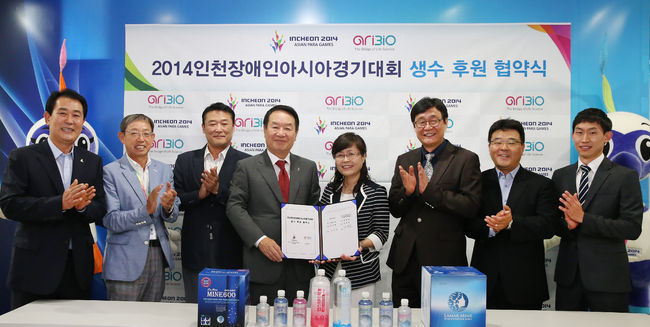 2014 인천장애인아시아경기대회조직위원회(위원장 김성일)는 (주)아리바이오(대표이사 성수현)와 16일 2014 인천장애인아시아경기대회 생수 후원 협약식을 가졌다.