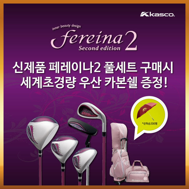 한국카스코 공식홈페이지(kascogolf.co.kr)에 접속해 페레이나 2 풀세트의 정품코드를 등록하면 참여할 수 있으며, 사은품은 선착순 200명에게 주어진다.