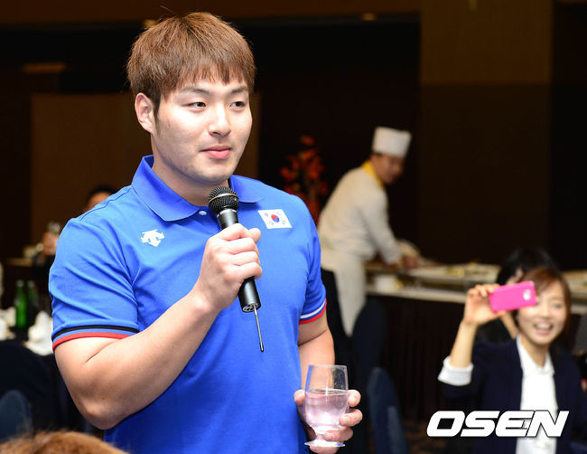 16일 오후 서울 청담동 리베라 호텔에서 열린 '리틀야구 월드시리즈 우승팀&AG 대표팀 만찬' 에서 아시안게임 대표팀 박병호가 건배 제의를 하고 있다.