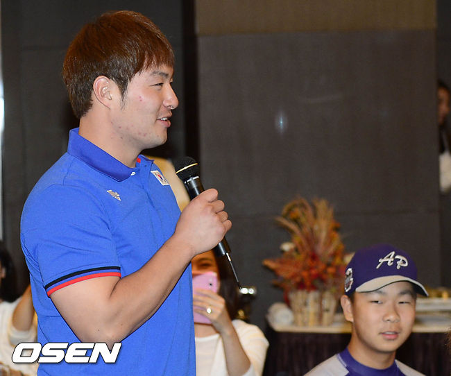 16일 오후 서울 청담동 리베라 호텔에서 열린 '리틀야구 월드시리즈 우승팀&AG 대표팀 만찬' 에서 아시안게임 야구대표팀 박병호가 건배제의에 앞서 인삿말을 하고 있다.