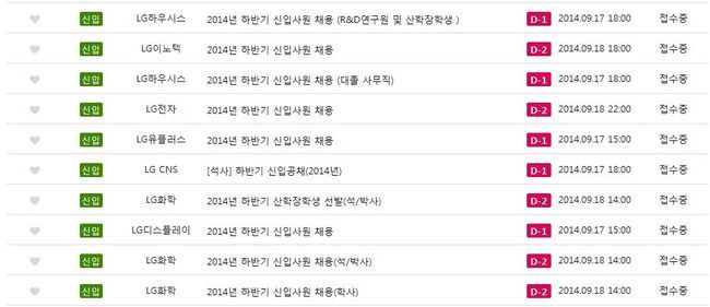 이 외에 LG이노텍, LG전자, LG화학 등의 회사는 18일까지 지원서를 접수하고, LG생활건강은 19일 오후 3시에 지원서 접수를 마감할 예정이다. 자세한 내용은 LG그룹 홈페이지를 통해 확인 가능하다.