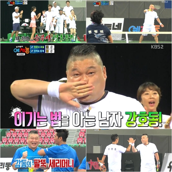 이날 강호동은 막강한 실력을 자랑하는 수원 테니스단을 상대로 첫득점에 성공하며 기선을 제압했다. 상대 권정미 선수는 유진선 해설위원도 인정한 실력파. 그러나 강호동은 파워 넘치는 권정미 선수에게 조금도 밀리지 않으며 첫득점을 올렸다.