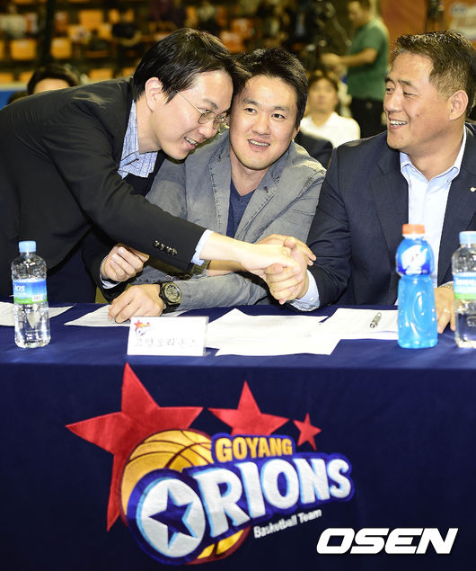 추첨 결과 고양 오리온스가 1라운드 첫번째 지명권을 얻고 추일승 감독과 관계자들이 기뻐하고 있다.