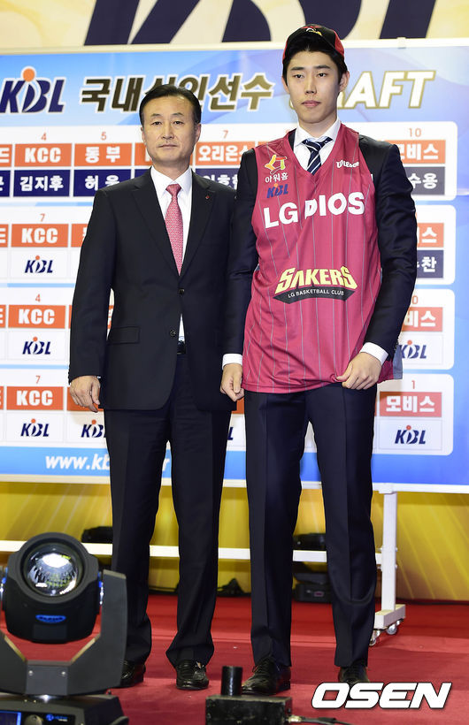연세대 주지훈이 2라운드 2순위로 LG 세이커스의 지명을 받고 포토타임을 갖고 있다.