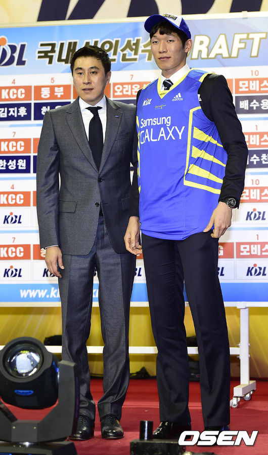 명지대 배강률이 2라운드 9순위로 삼성 썬더스에 지명되어 이상민 감독과 포토타임을 갖고 있다.