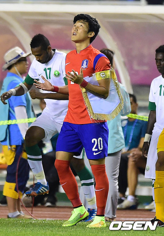 17일 오후 안산와스타디움에서 열린 2014 인천 아시안게임 남자 축구 A조 조별리그 2차전 한국과 사우디아라비아의 경기 시작전 장현수가 경기장에 입장하며 하늘을 바라보고 있다.