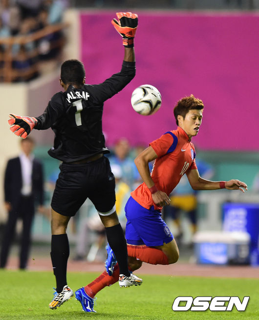 17일 오후 안산와스타디움에서 열린 2014 인천 아시안게임 남자 축구 A조 조별리그 2차전 한국과 사우디아라비아의 경기 전반 김승대가 슈팅 기회를 놓치고 있다.