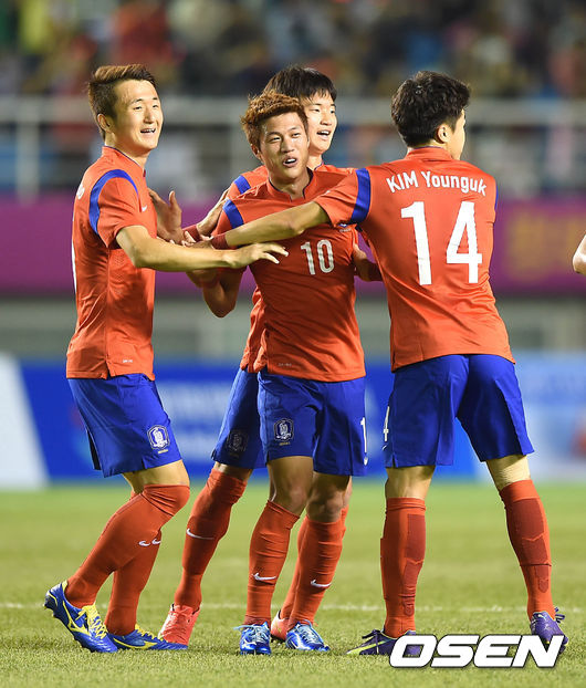17일 오후 안산와스타디움에서 열린 2014 인천 아시안게임 남자 축구 A조 조별리그 2차전 한국과 사우디아라비아의 경기 전반 골을 성공시킨 한국 김승대가 동료들과 환호하고 있다.