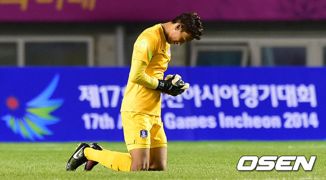 17일 오후 안산와스타디움에서 열린 2014 인천 아시안게임 남자 축구 A조 조별리그 2차전 한국과 사우디아라비아의 경기 전반 김승대가 골을 넣자 김승규가 무릎을 꿇고 기도를 하고 있다.