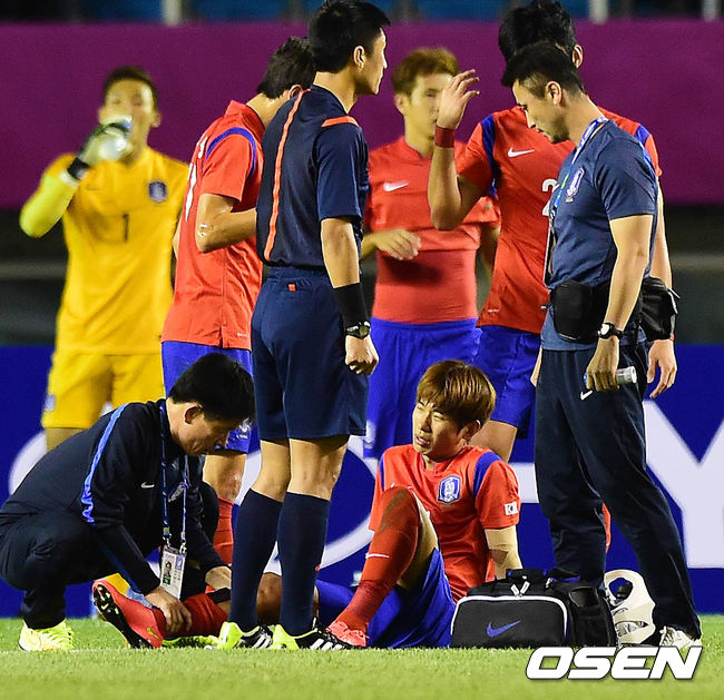 17일 오후 안산와스타디움에서 열린 2014 인천 아시안게임 남자 축구 A조 조별리그 2차전 한국과 사우디아라비아의 경기 전반 윤일록이 부상을 당해 그라운드에 앉아 있다.