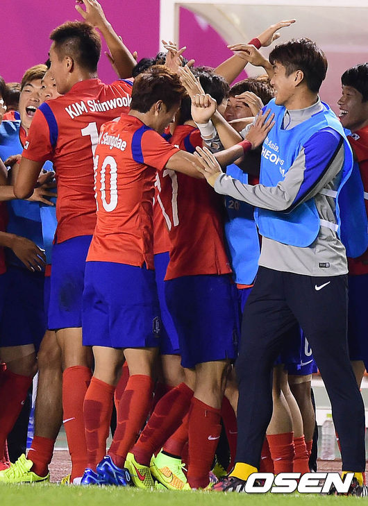 17일 오후 안산와스타디움에서 열린 2014 인천 아시안게임 남자 축구 A조 조별리그 2차전 한국과 사우디아라비아의 경기 전반 김승대가 골을 넣고 동료들과 기쁨을 나누고 있다.