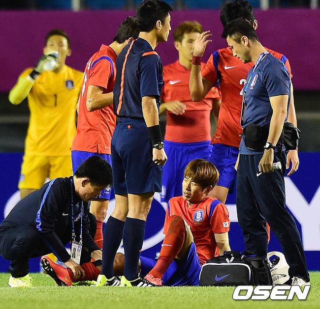 17일 안산 와스타디움에서 열린 2014 인천 아시안게임 조별예선 2번째 경기인 사우디아라비아전에서 한국은 전반 12분 왼쪽 측면에서 가운데로 넣은 김승대(포항)의 패스가 그대로 골문 안으로 들어가 1-0으로 앞섰다. 하지만 2명이 부상으로 교체된 것은 악재였다.
