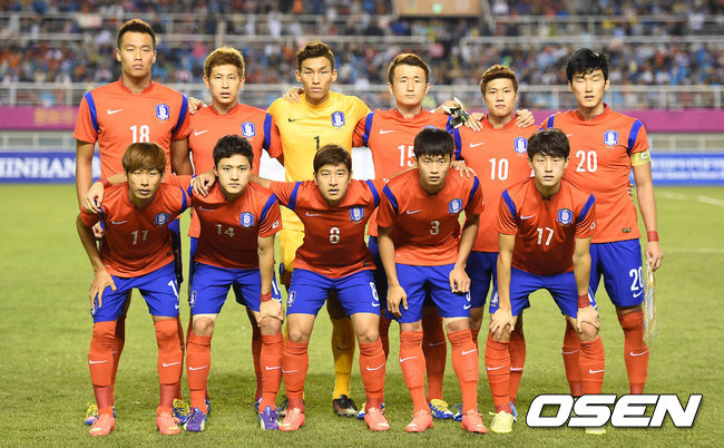 17일 오후 안산와스타디움에서 열린 2014 인천 아시안게임 남자 축구 A조 조별리그 2차전 한국과 사우디아라비아의 경기에 앞서 한국 선수들이 기념촬영을 하고 있다.