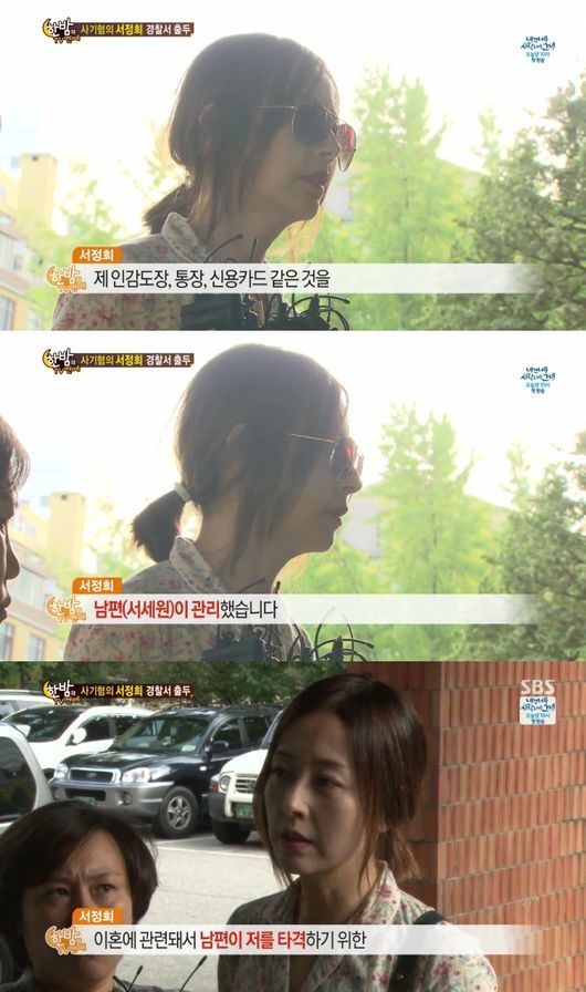 서정희 측근은 "자동이체하던 통장을 다 서세원 씨가 가져가서 돈을 못 내서 직므 전화사용도 안된다. 지금 호텔에서 묵고 있다. 굉장히 많이 속상해 하고 있다. 사건이 한 두 개가 아니니까"라고 털어놓았다.