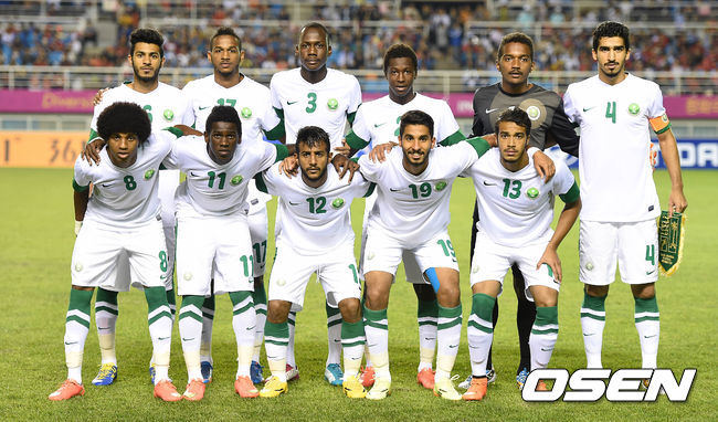 17일 오후 안산와스타디움에서 열린 2014 인천 아시안게임 남자 축구 A조 조별리그 2차전 한국과 사우디아라비아의 경기에 앞서 사우디 선수들이 기념촬영을 하고 있다.