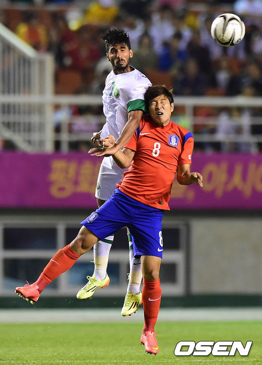 17일 오후 안산와스타디움에서 열린 2014 인천 아시안게임 남자 축구 A조 조별리그 2차전 한국과 사우디아라비아의 경기 후반 박주호가 공중볼 다툼을 하고 있다.