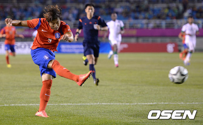 17일 오후 안산와스타디움에서 열린 2014 인천 아시안게임 남자 축구 A조 조별리그 2차전 한국과 사우디아라비아의 경기 후반 한국 이용재가 슛을 시도하고 있다.