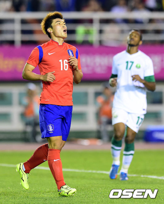 17일 오후 안산와스타디움에서 열린 2014 인천 아시안게임 남자 축구 A조 조별리그 2차전 한국과 사우디아라비아의 경기 후반 이종호가 자신의 슛이 빗나가자 아쉬워하고 있다.
