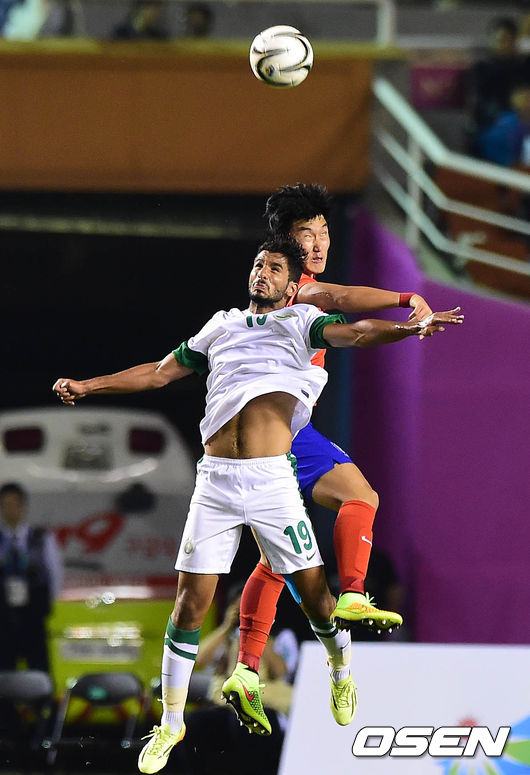 17일 오후 안산와스타디움에서 열린 2014 인천 아시안게임 남자 축구 A조 조별리그 2차전 한국과 사우디아라비아의 경기 후반 장현수가 공중볼 다툼을 하고 있다.