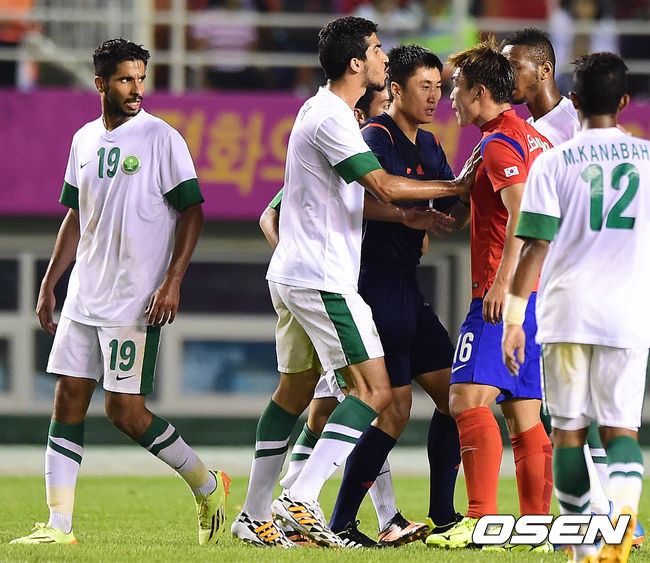17일 오후 안산와스타디움에서 열린 2014 인천 아시안게임 남자 축구 A조 조별리그 2차전 한국과 사우디아라비아의 경기 후반 이종호가 사우디아라비아 선수와 신경전을 벌이고 있다.