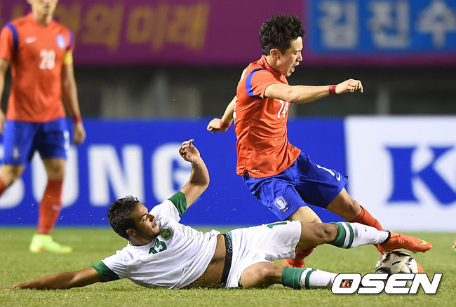 17일 오후 안산와스타디움에서 열린 2014 인천 아시안게임 남자 축구 A조 조별리그 2차전 한국과 사우디아라비아의 경기 후반 한국 김영욱이 상대 태클에 걸려 넘어지고 있다.