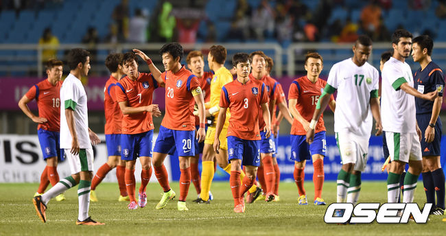이광종 감독이 이끄는 한국은 17일 오후 8시 안산 와스타디움에서 열린 2014 인천 아시안게임 남자 축구 A조 조별리그 2차전서 전반 12분 터진 김승대의 결승골에 힘입어 사우디 아라비아(이하 사우디)를 1-0으로 제압했다.