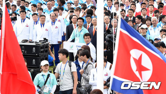 입촌식에 참석한 북한 선수단이 국기를 바라보고 있다.