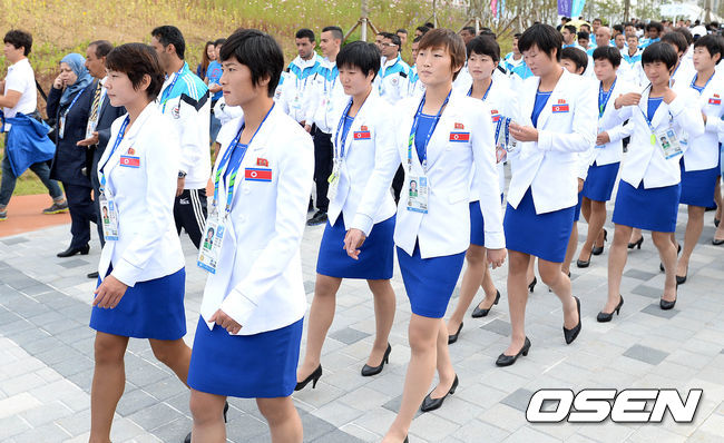입촌식에 참석한 북한 선수단이 퍼레이드를 진행하고 있다.