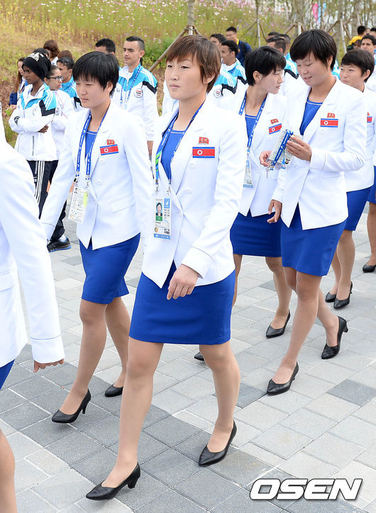 입촌식에 참석한 북한 선수단이 퍼레이드를 진행하고 있다.