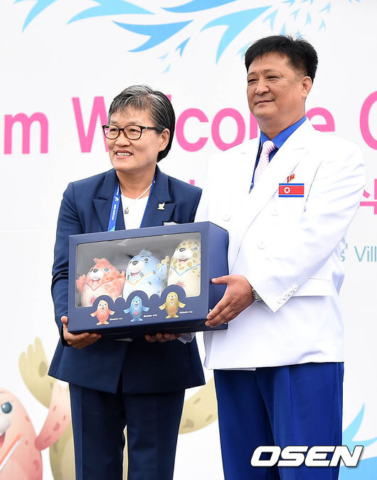 이에리사 선수촌장이 북한 김병식 단장과 기념촬영을 하고 있다.
