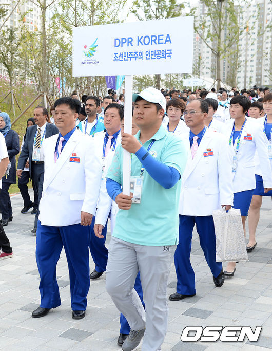 북한 선수단이 퍼레이드에 참석하고 있다.