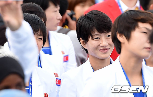 북한 선수단이 축하공연을 보며 미소짓고 있다.