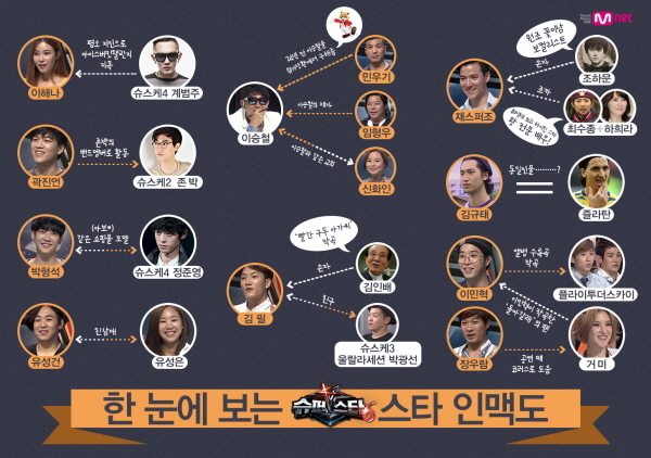 엠넷 측은 18일 '슈퍼스타K6' 공식 페이스북 페이지를 통해 이번 시즌 참가자들의 스타 인맥을 한 장의 그림으로 정리한, '한 눈에 보는 슈퍼스타K6 스타 인맥도'를 공개했다.