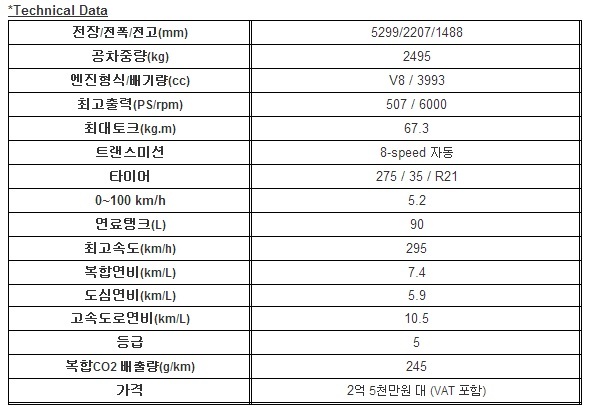 국내 출시 가격은 2억 5000만 원 대 (VAT 포함)부터 시작하며 선택 사양에 따라 가격은 달라진다.
