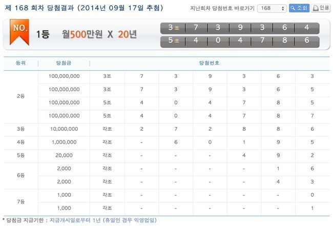17일 나눔로또에 따르면 연금복권 167회 1등 당첨번호는 '3조739364'과 '5조404786'이다. 연금복권 168회 1등 당첨자에게는 20년간 매달 500만원씩 연금 형식으로 당첨금이 지급된다. 세금을 뗀 실제 수령액은 약 390만원 정도.