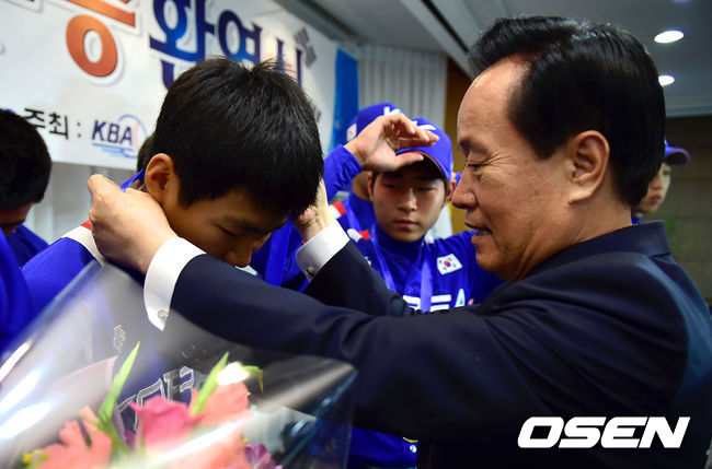 KBA 이병석 회장이 청소년 대표팀 선수들에게 메달을 걸어주고 있다.