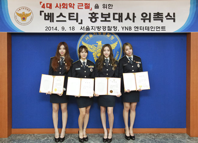 베스티는 18일 오전 11시 서울지방경찰청(청장 구은수)에서 4대 사회악(성․학교․가정폭력, 불량식품) 근절 홍보대사로 위촉됐다.