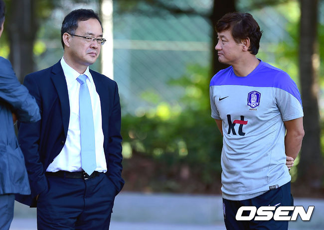 18일 오후 경기도 파주 NFC(국가대표축구트레이닝센터)에서 진행된 아시안게임 축구대표팀 훈련에서 이광종 감독이 경기장을 찾은 이용수 기술위원장과 이야기를 나누고 있다.