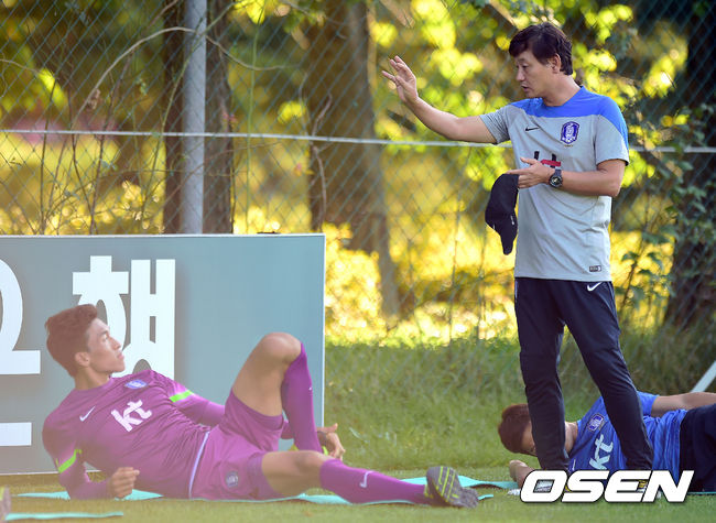 18일 오후 경기도 파주 NFC(국가대표축구트레이닝센터)에서 진행된 아시안게임 축구대표팀 훈련에서 이광종 감독이 김승규와 이야기를 나누고 있다.