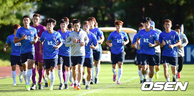 18일 오후 경기도 파주 NFC(국가대표축구트레이닝센터)에서 진행된 아시안게임 축구대표팀 훈련에서 선수들이 러닝을 하고 있다.