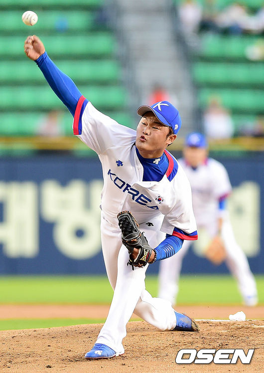 대표팀 선발 홍성무가 힘차게 공을 뿌리고 있다.