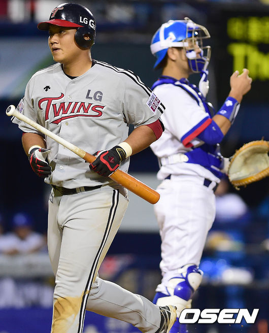 3회초 LG 공격 2사 주자없는 상황 최승준이 대표팀 투수 김광현을 상대로 중월 솔로포를 날리고 홈을 밟은 뒤 더그아웃으로 향하고 있다.