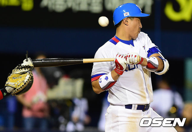 3회말 대표팀 공격 무사 1루 상황 황재균이 LG 투수 신동훈의 공에 몸을 맞으며 깜짝 놀라고 있다.