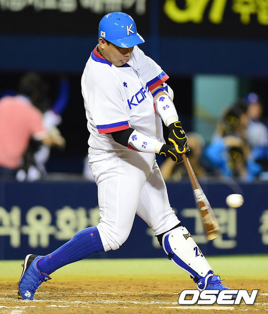 6회말 대표팀 공격 2사 1, 2루 상황 나지완이 1타점 적시 좌전안타를 날리고 있다.