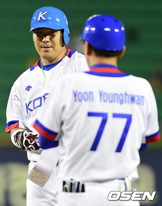 6회말 대표팀 공격 2사 1, 3루 상황 이재원이 1타점 적시타를 날리고 윤영환 코치와 인사를 나누고 있다.