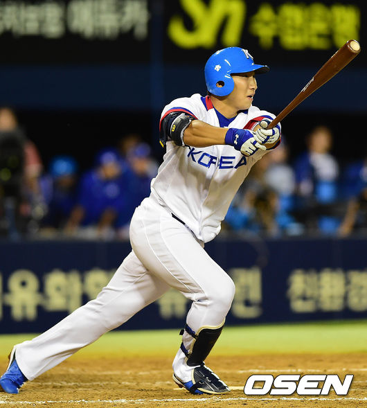 8회말 대표팀 공격 선두타자로 나선 나성범이 우익선상 2루타를 날리고 있다.